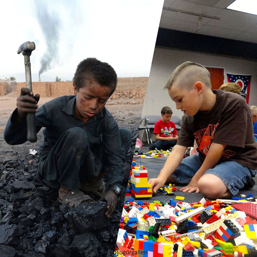 Some children have very little playtime at all, like an Afghan boy who works at a coal yard—while across the world another boy plays with Legos.