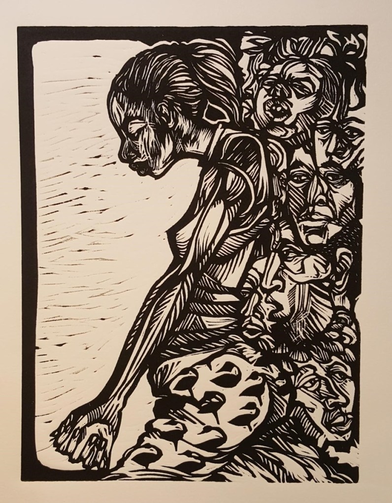 Steve Prince, Faith Walk. Linocut, 12 × 9 in. “Shows a woman walking in faith while the ancestors encourage, uplift, and guide her along the way.”Jehova es mi luz (Jehovah Is My Light), San Blas Islands, Panama, 1980s. Reverse embroidery, 14 × 17 1/2 in.Joseph di Bella, Tree Parables (Generations), 2017. Gouache, dry pigment, and ashes on handmade paper, 38 1/2 × 30 1/2 × 1 1/2 in. (framed).