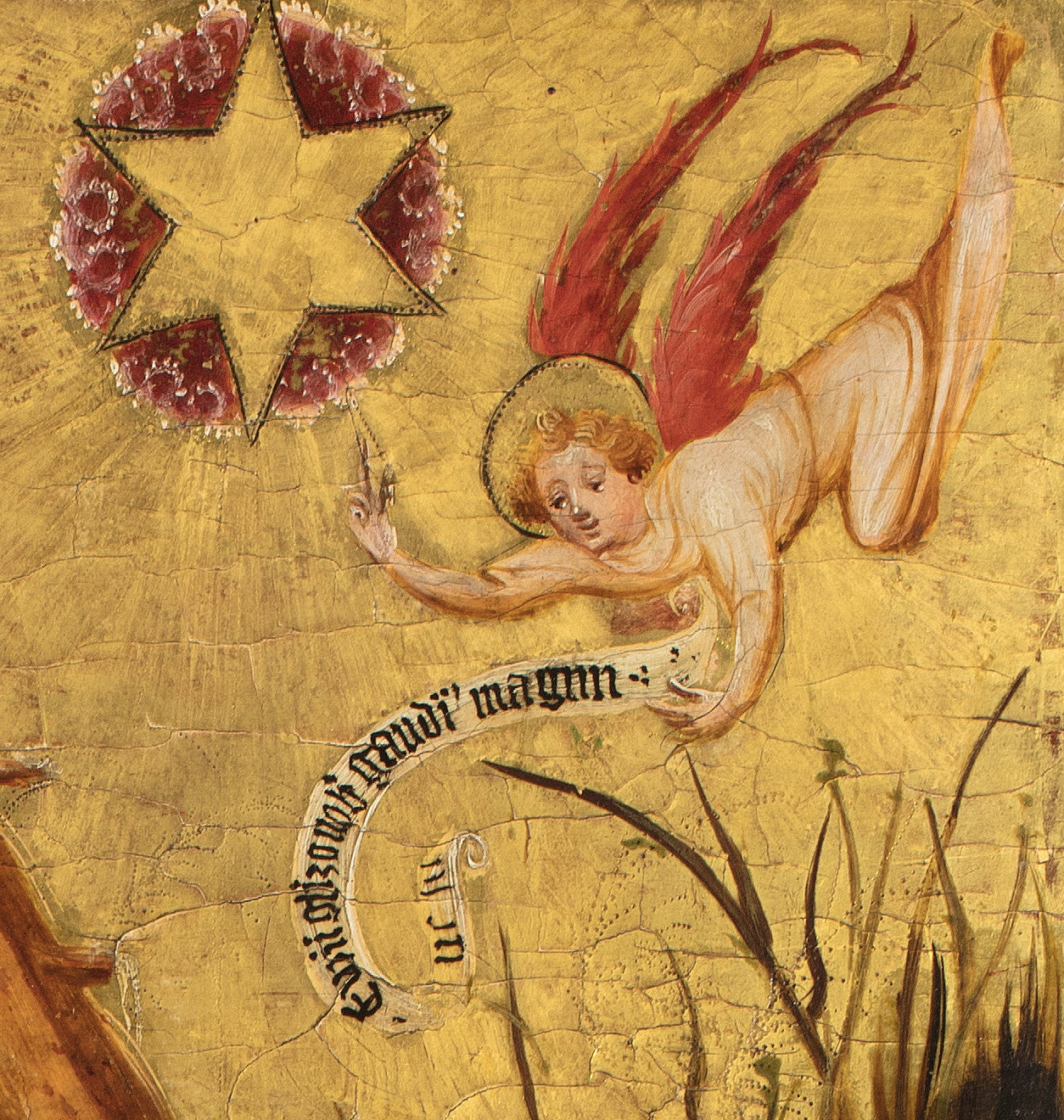 As in medieval visual treatments of the Dream of the Magi, Cazalet has the magi sharing a bed. (There’s nothing salacious about it—it’s just a compositional practicality, to show the three men in one space, having the same dream at the same time.) Their toes peep out from under the covers. That surface, by the way, is flat—Cazalet skillfully creates the illusion of convexity through painting, suggesting bodies underneath.