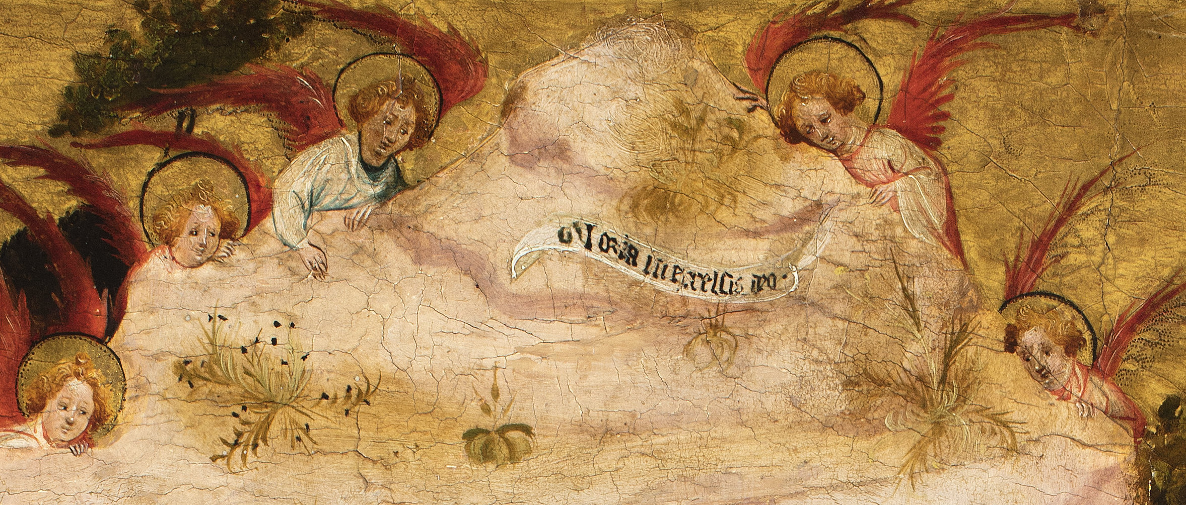 The two side panels, which show a close-up of an open ear and an open mouth, likely refer to, in his prophetic ministry as an adult, John’s hearing the word of God and proclaiming it. His is “the voice of one crying out in the wilderness: ‘Prepare the way of the Lord; make his paths straight’” (Mark 1:3). John is regarded as an Advent figure because, by preaching repentance from sin, he prepared the people for the coming of the Messiah.