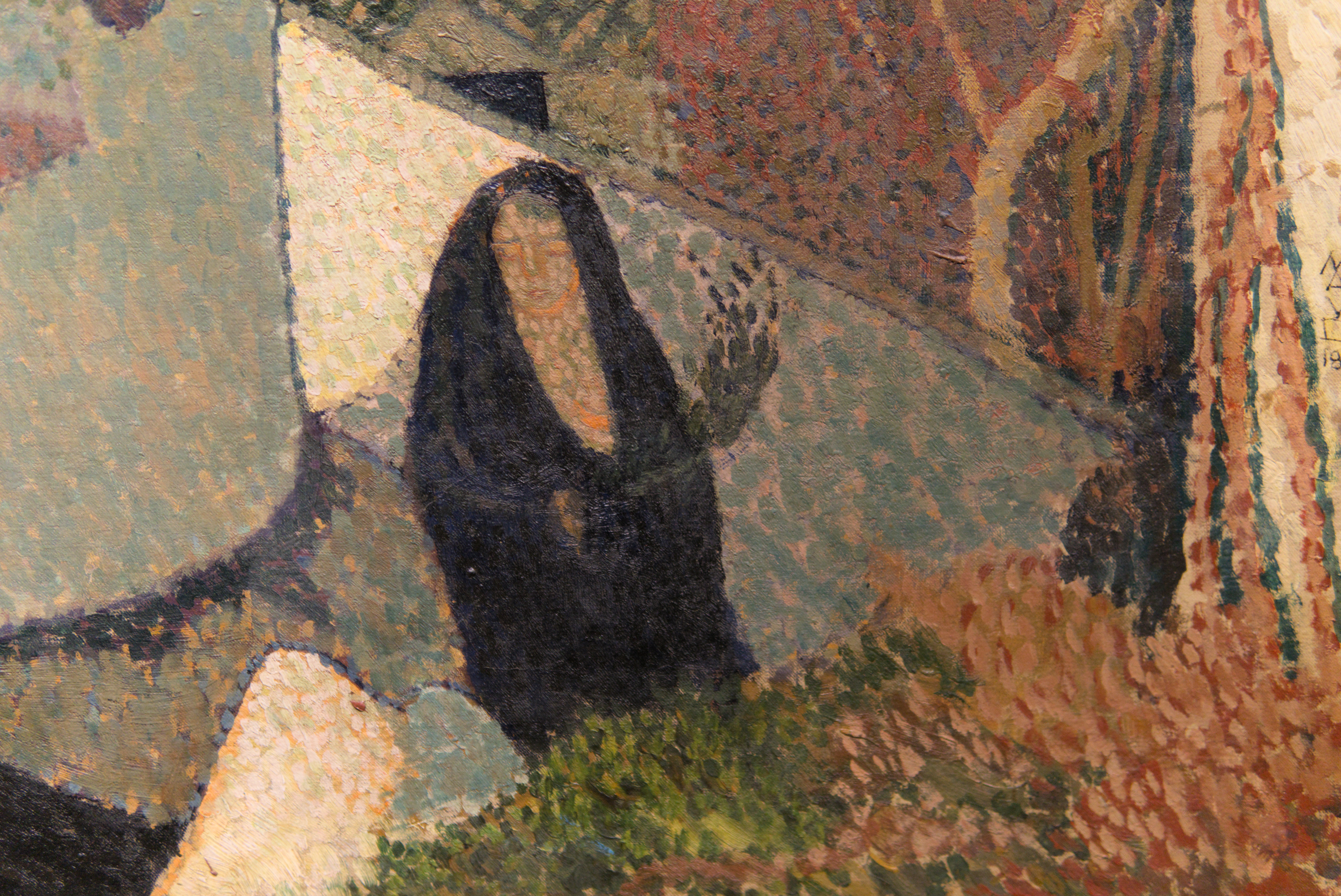 Denis strived for simple, flattened forms that sometimes verge on abstraction. He believed this process reflected spiritual purification, and he looked to the work of early Italian Renaissance art, and especially to the work of the painter monk Fra Angelico for inspiration. But he and the other Nabis were also deeply influenced by avant-garde French art. Here, Denis explores the effects of the pointillist technique of building up the picture surface with tiny dots of paint.