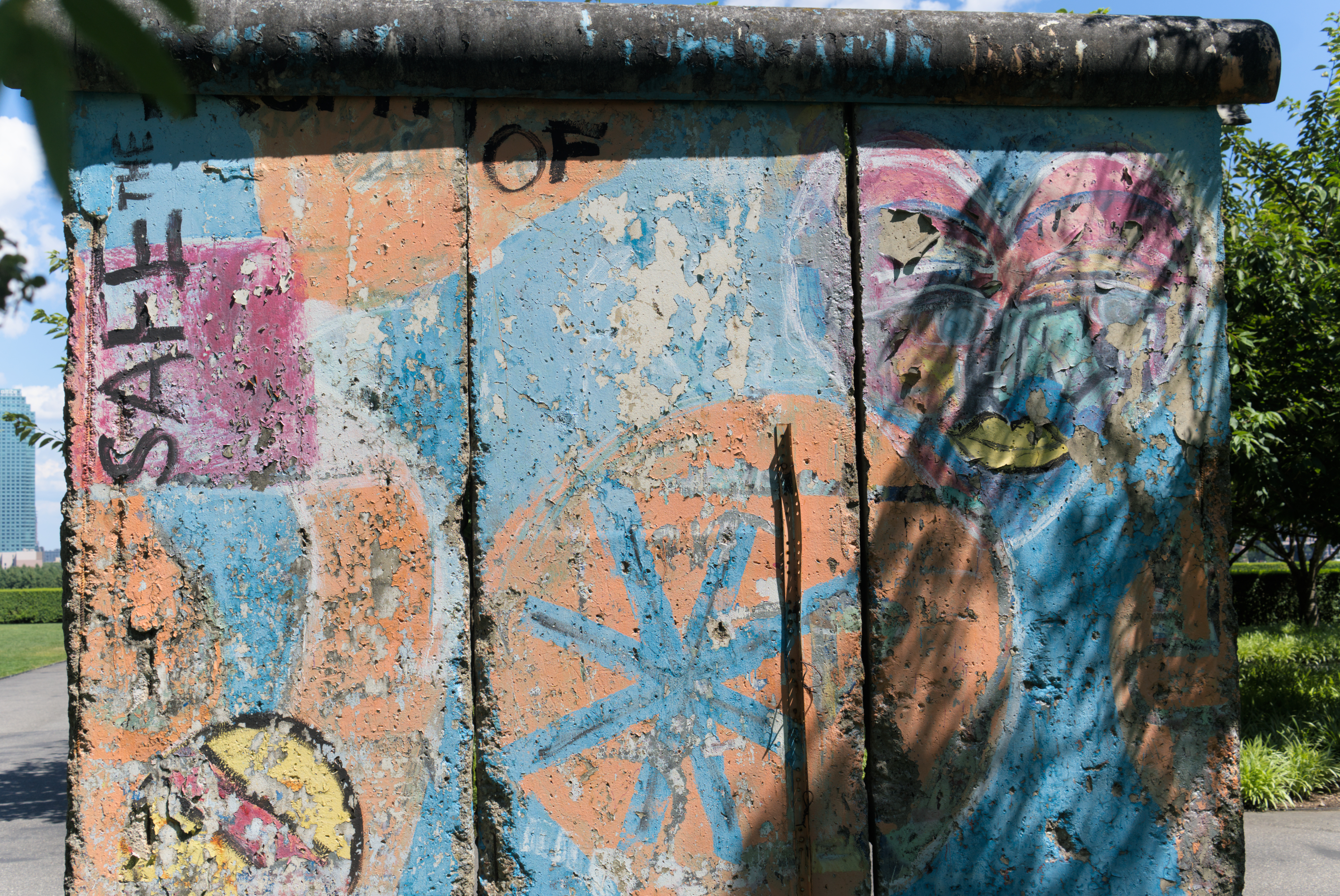 The front of this three-slab wall fragment (that is, the side visible from the paved path) bears a mural by Kani Alavi, an Iranian artist who moved to West Berlin in 1980, living in an apartment overlooking the formidable “Checkpoint Charlie.” Throughout the 1980s, artists painted images on the west side of the wall as a form of political commentary and resistance. The east side, however, was unpainted during the Cold War because it was so heavily guarded; attempted art interventionists probably would have been shot.