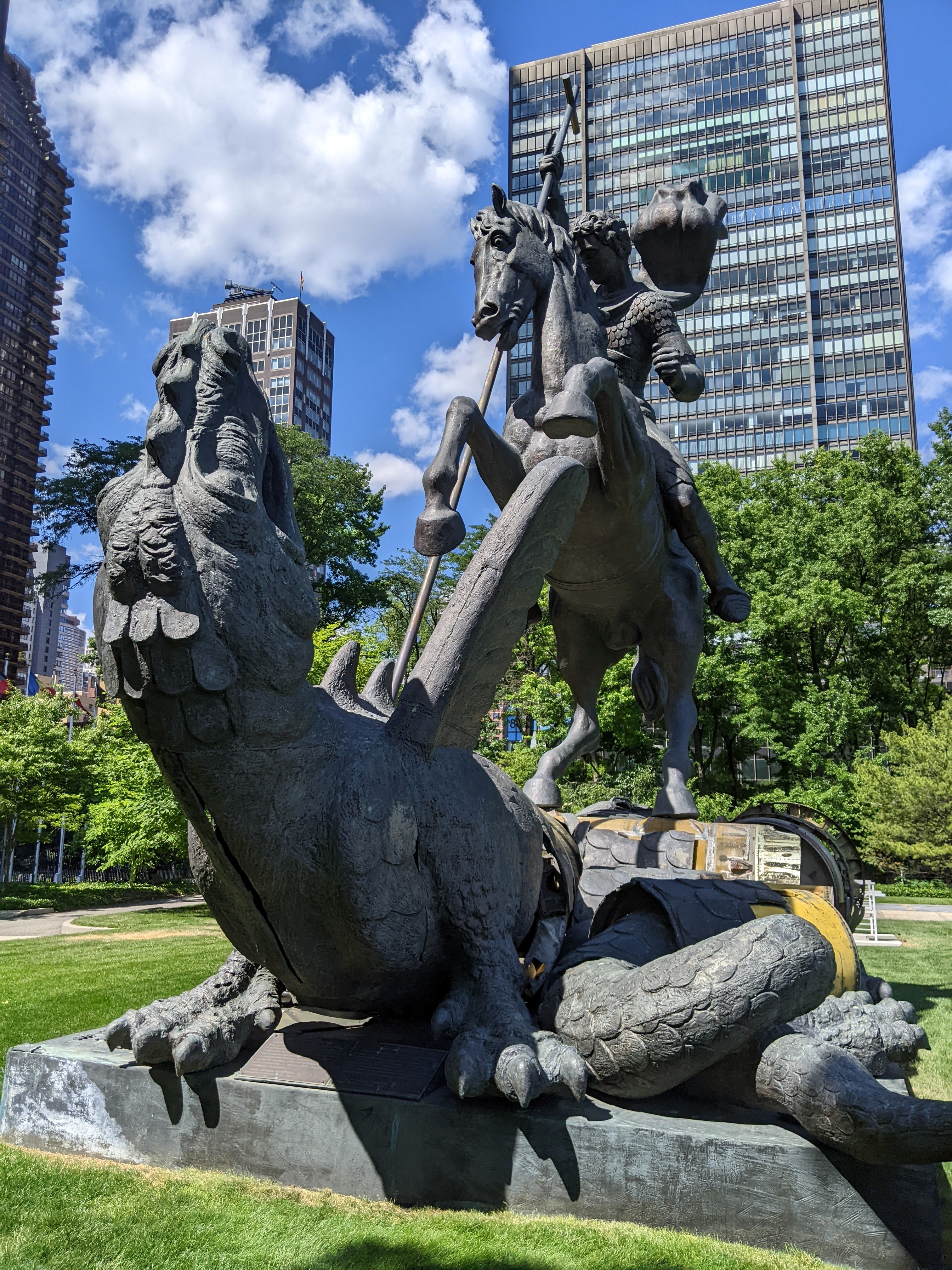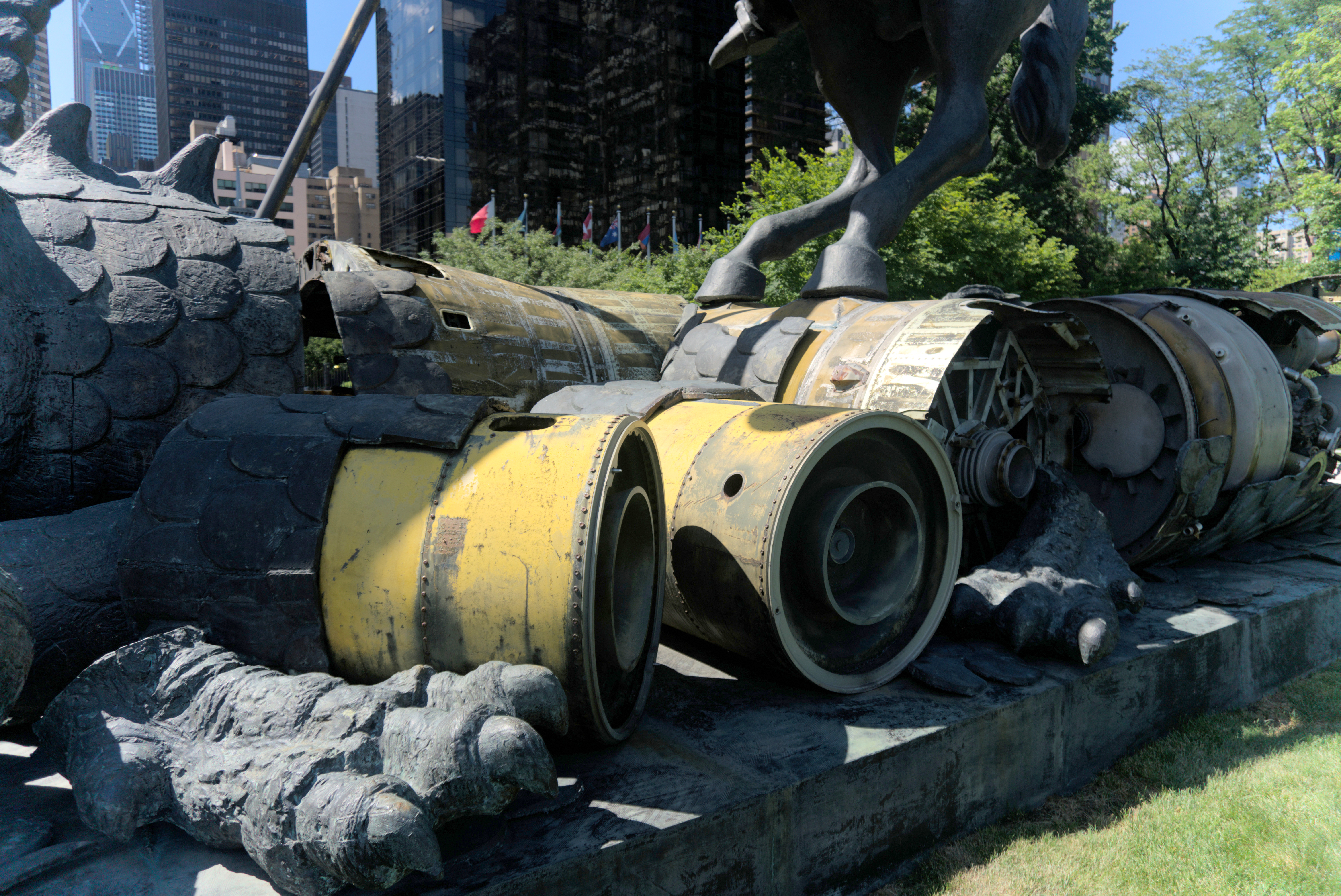 the dragon is not the mythological beast of early Christian tradition, but rather represents the vanquishing of nuclear war through the historic treaty between the Soviet Union and the United States [the Treaty on the Elimination of Intermediate-Range and Short-Range Nuclear Missiles, signed in 1987]. Created as a monument to peace, the sculpture is composed of parts of actual United States and Soviet missiles. Accordingly, the dragon is shown lying amid actual fragments of these weapons, the broken pieces of Soviet SS-20 and U.S. Pershing missiles.