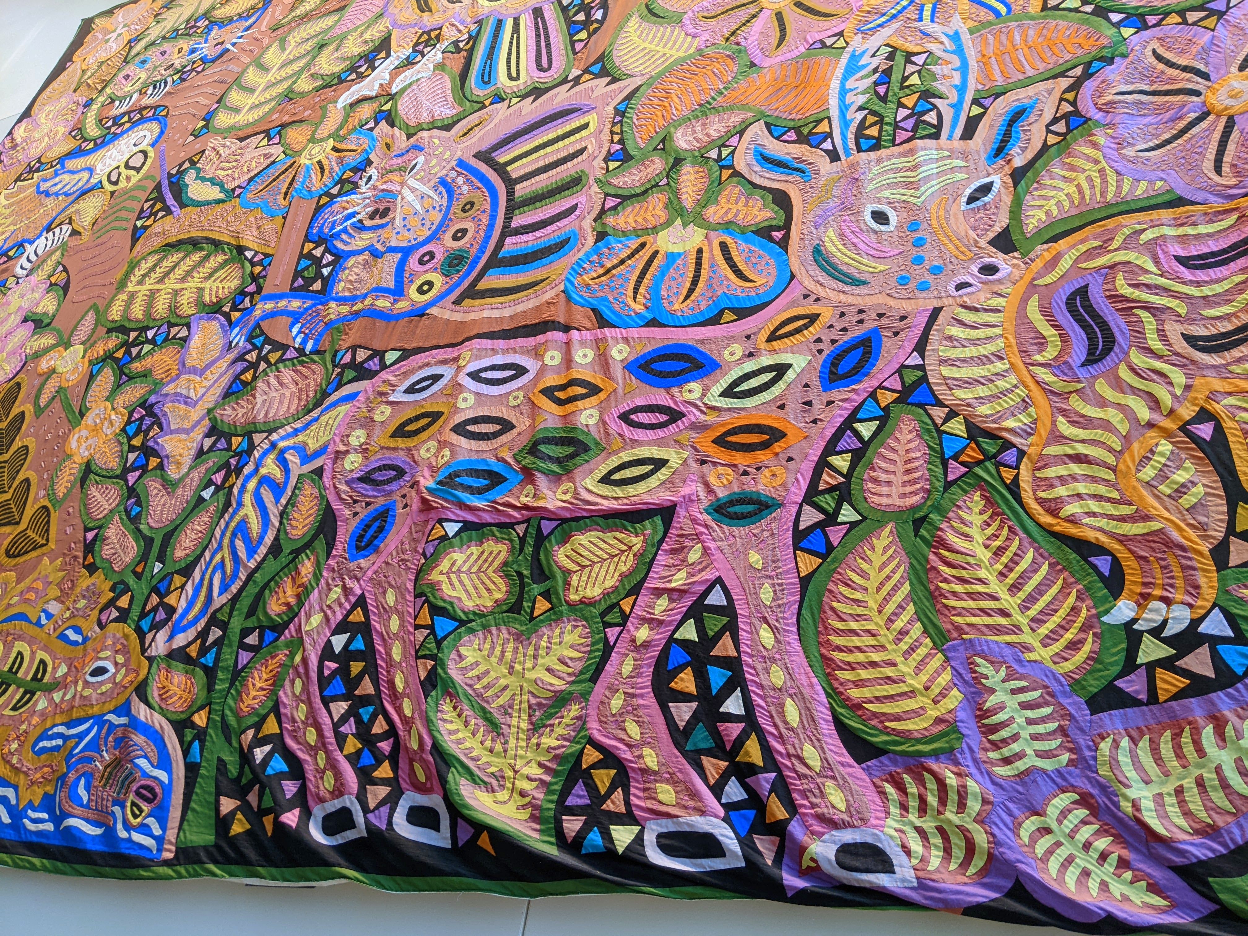 Molas are made using a reverse appliqué technique, in which several layers of multicolored cloth are sewn together and then parts of each layer are cut out to form the design. These textile panels are traditionally made on a smaller scale and sewn onto women’s blouses, but as outside interest in them grew, local artisans started making some to be displayed as wall hangings.