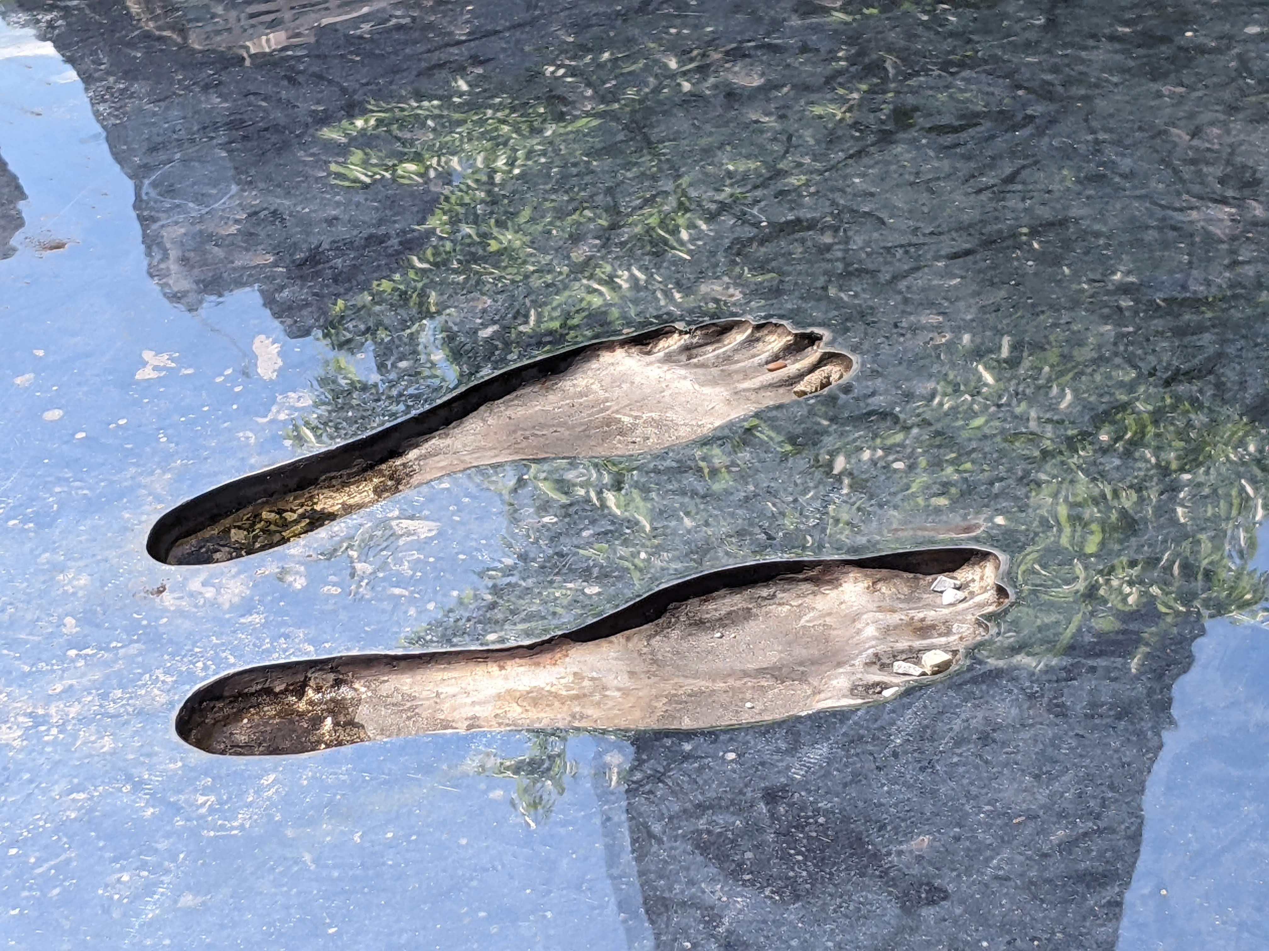 The last sculpture I’ll mention is Consciousness by the Mongolian artist Ochirbold Ayurzana. It consists of a rounded, high-luster steel alloy floor plate on which stands a human figure, made of twisted metal strings, examining the footprints they’ve left on the planet. What mark will we make, for good or ill? The sculpture is dedicated to the historic adoption of two global developmental milestone documents: the UN 2030 Agenda for Sustainable Development and the Paris Agreement on Climate Change.