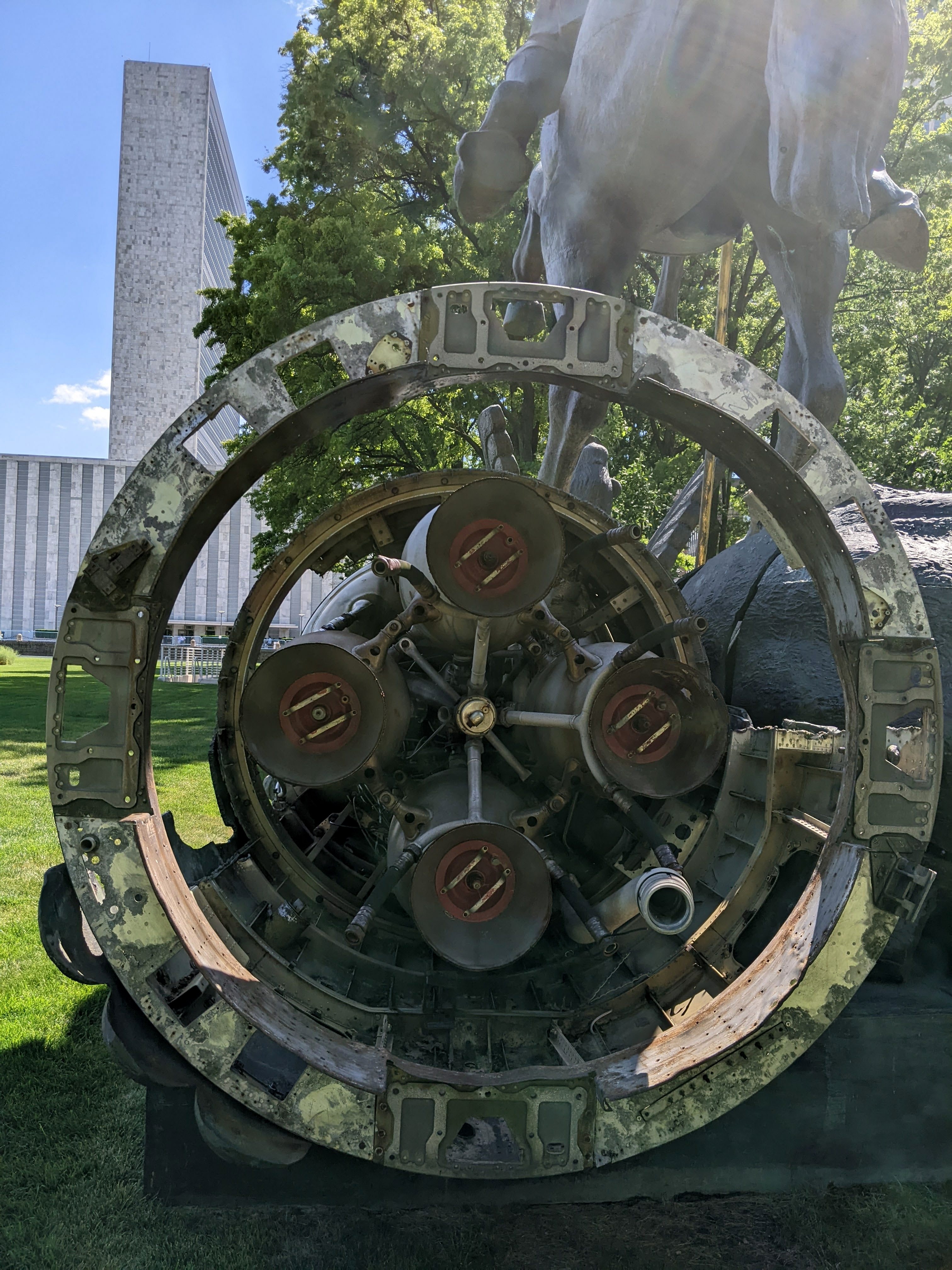 I had seen photos of the biblically inspired Let Us Beat Swords into Ploughshares and wanted to see it in person, so I paid up. It’s vaguely visible from the vantage of the free-access plaza outside the main entrance of the General Assembly Building.