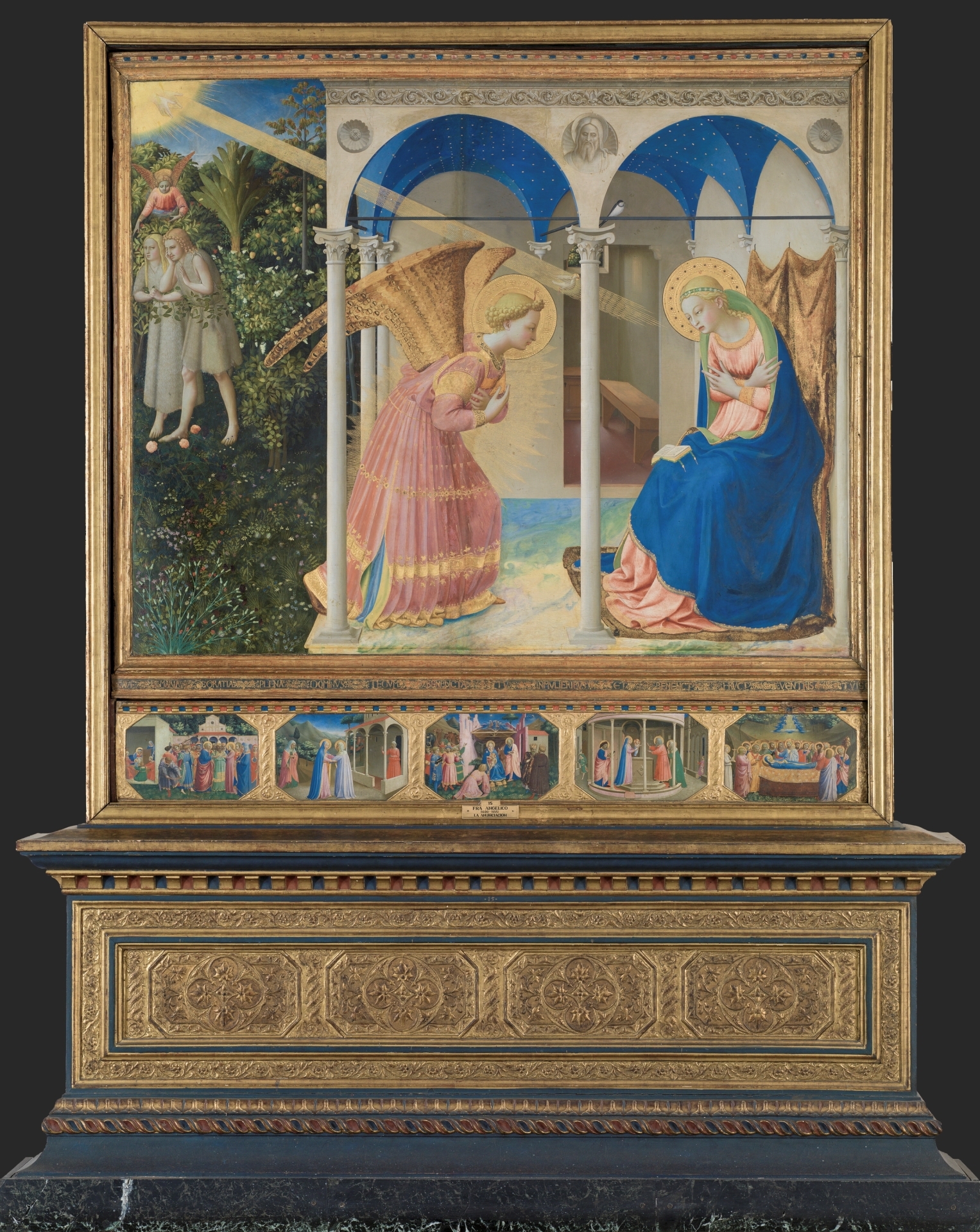 And the Annunciation is only the main panel. Along the predella (base) are depicted the Marriage of the Virgin, the Visitation, the Nativity, the Presentation of Christ in the Temple, and the Dormition (the “falling asleep,” or death, of Mary).
