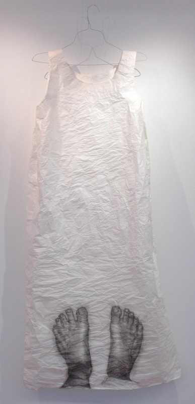 We Are is the name of a solo exhibition of hers from 2010 consisting of life-size drawings and lithographs of human feet and a foot-washing performance. Shin executed thirty-four graphite drawings on paper as well as on paper garments that she custom-made. The structural anchor of the installation was five muslin panels, each ten yards long, suspended from the ceiling and draped like a hammock. On the upper reaches of each were lithographs of two pairs of legs, and in the bed of the hammock lay a mat, a pillow, and a paper dress. Leading up to the hammock was a long sheet of paper with twelve sets of footprints arranged in two rows, evoking Jesus’s twelve disciples.