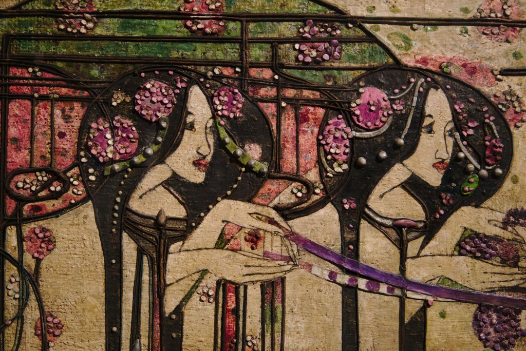 James N. Carder describes the image: “Side-by-side are seen the bust-length figures of Christ as Savior (Salvator Mundi), holding a cruciform orb and making a blessing gesture, and the Virgin Mary crowned as Queen of Heaven and with her hands together in prayer before an open book on the ledge. The lower field of the foreground is profusely ornamented with floral (millefleurs) motifs, and above the arches are a row of Gothic ornaments and a cloisonné-like geometric band that are reminiscent of the tops of French enamel reliquaries.”